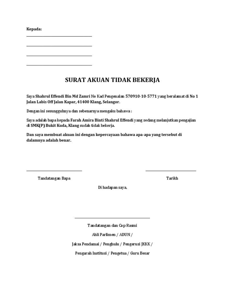 Contoh Surat Tidak Bekerja : Contoh Surat Izin Orang Tua Untuk Bekerja Di Indomaret Download File Doc Neicy Tekno. Surat pernyataan tidak bekerja/ tidak mempunyai pekerjaan. Lalu, bagaimana cara membuat paklaring kerja? Simak artikel menarik lainnya di lokerbali.info. Simak contoh surat selengkapnya disini! Contoh surat pernyataan untuk menyatakan sedang tidak bekerja. Paklaring atau yang sering dikenal dengan surat keterangan kerja merupakan surat yang dibutuhkan seseorang ketika sudah tidak bekerja di perusahaan. Menyatakan bahwa saat ini belum bekerja, atau belum memiliki pekerjaan tetap. Simak berbagai artikel menarik lainnya disini!